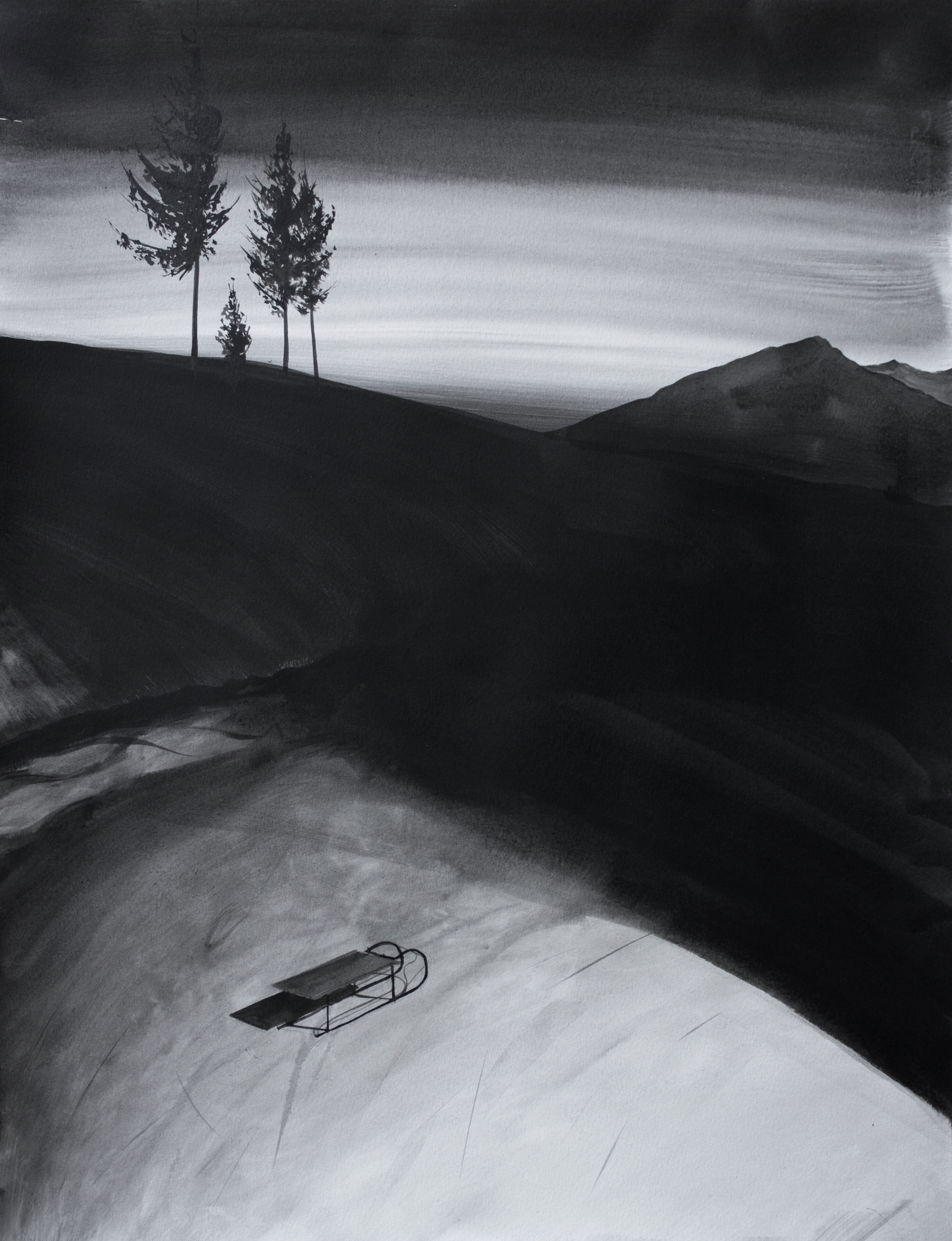 Em uma de suas pinturas em preto e branco, um trenó é abandonado em uma paisagem branca, levando o artista a rememorar o vazio, o sem vida. Ele leva o olhar do espectador ao infinito, não levando em conta o tempo. A neve traz o retorno à infância, e a nostalgia é um sentimento marcante, sem necessariamente invocar a tristeza. O sentimento provocado é agradável e reconfortante, como um refúgio acolhedor.