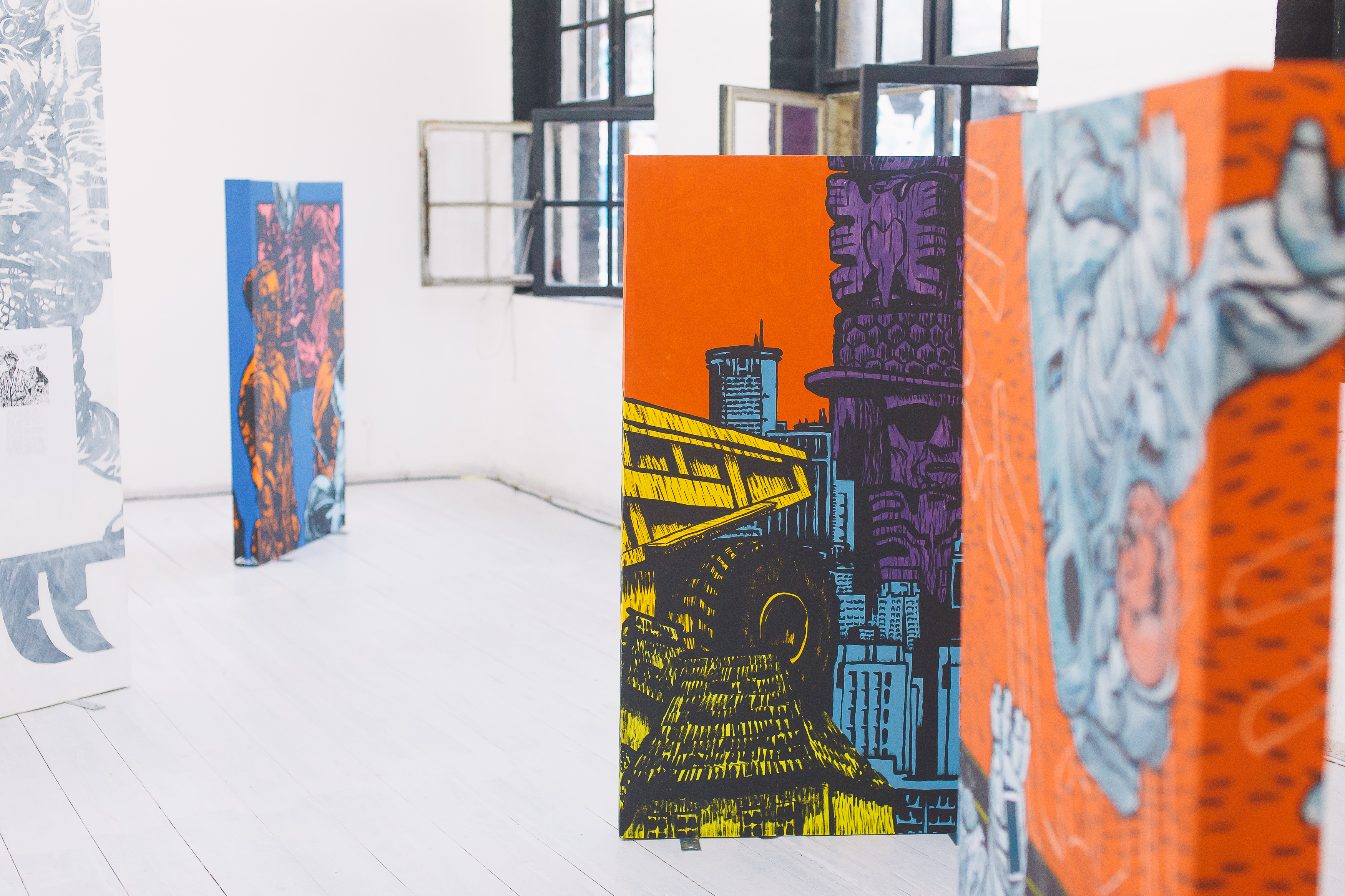 As pinturas falam sobre uma cidade de esperanças arruinadas apesar do uso de cores fortes e exaltadas.